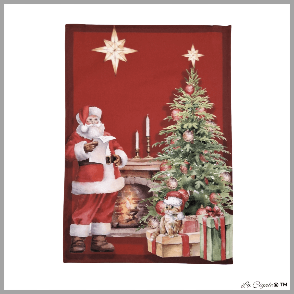 This dishtowel features Santa Claus and a orange kitty with Christmas presents by the warm glow of the fireplace and a decorated Christmas tree on a red background with a red border.